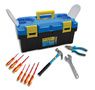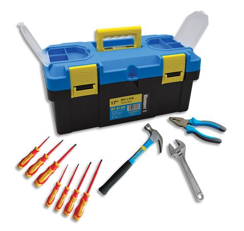 Mallette à outils en plastique avec 10 outils inclus : pince coupante, marteau, clé à molette, tournevis (7 pièces). Coloris jaune et bleu. Dimensions (l x h x p) : 40 x 18 x 25 cm.