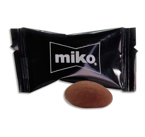 Amande grillée enrobée de chocolat au lait en emballage individuel.