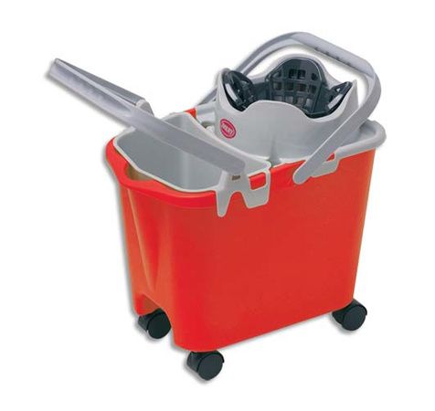 En plastique et polypropylène. Ensemble équipé d'un seau de 15L et d'un mini seau de 3 litres pour l'eau propre, pouvant aussi faire office de bac porte produits. Elément de fixation pour le manche, bec verseur pour la vidange. Equipé de 4 roulettes.