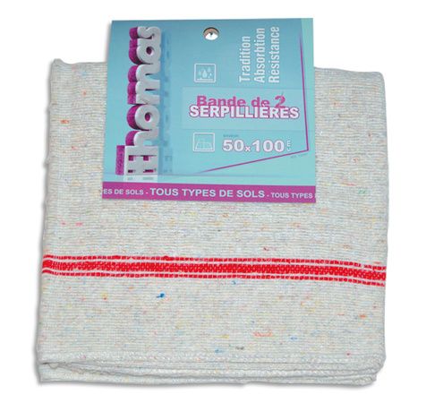 15 bandes à couper soit 30 serpillières lavables en machine jusqu'à 90°c. Très absorbantes. Coton majoritaire 420 g/m2.