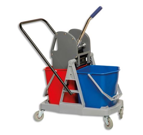 Chariot de lavage avec presse à machoire et 2 seaux de 18 litres (15 litres utile). Base et presse grises. Seaux bleu et rouge.4 roues directionnelles. Guidon réversible. Support presse polypropylène. Presse pour faubert et lavage professionnel à plat. Roulettes montées.