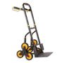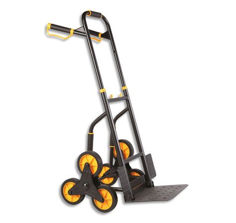 Diable d'escalier 200 kg structure en tube acier. 2 x 3 roues en étoile bandage TPR diamère 15 cm sur jante plastique. Charge utile maximum : 200 kg à usage normal et 120 kg en montée d'escalier. Une bavette acier rabattable (l x p) : 35 x 28 cm. Poignée caoutchouc.