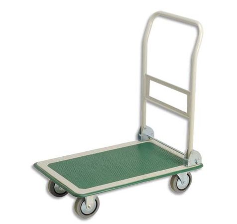 Poignée en tube acier peint repliable et blocable, déverrouillage au pied. Plateau en acier embouti renforcé avec revêtement anti-dérapant. Pare-chocs de sécurité. Equipé de 4 roulettes silencieuses dont deux pivotantes, Ø12,5 cm, bandage résiprène.