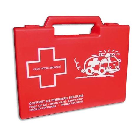 Détail du contenu : 1 sachet de 18 pansements adhésifs assortis, 1 rouleau de sparadrap 5 m x 2 cm, 5 compresses de gaze stériles 20 x 20 cm, 2 bandes extensibles 3 m x 7 cm, 1 paire de ciseaux, 1 pince à échardes, 2 compresses antiseptiques, 1 paire de gants vinyle. Détail du contenu et code barres au dos.