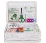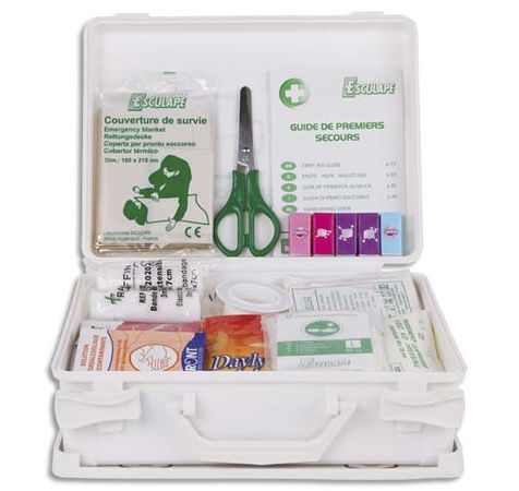 Coffret en polypro blanc 26 x 20 x 9 cm. Avec support mural. Contenu : 1 couverture de survie, 5 morceaux de sucre individuels, 1 écharpe triangulaire, 5 compresses stériles 5 x 5 cm, 2 bandes extensibles 3 m x 7 cm, 1 filet tubulaire taille 3, 1 pansement compressif grand modèle, 2 sacs de récupératon des déchets, 1 paquet de 10 mouchoirs compressifs, 2 pochettes de serviettes périodiques, 20 pansements adhésifs assortis, 10 doses de gel bactéricide, 10 compresses à la chlorhexidine, 3 paires de gants vinyle, 1 pince à échardes, 1 paire de ciseaux 10 cm, 1 rouleau de sparadrap 5 m, 1 guide de 1er secours.