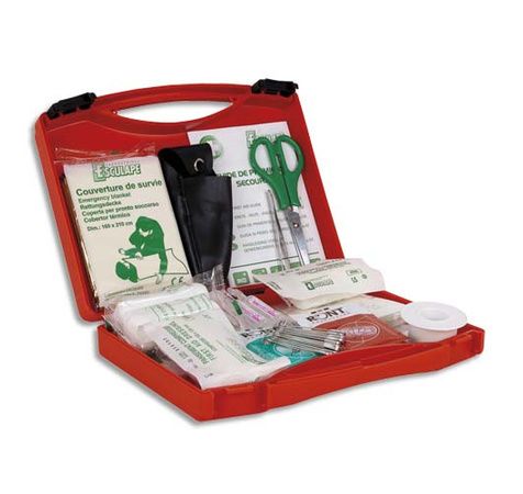 1 Couverture de survie. 10 Compresses stériles 5 x 5 cm. 2 Bandes extensibles en 3 m x 7 cm. 1 Rouleau de sparadrap 5 m x 2 cm. 18 Pansements adhésifs assortis. 1 Pansement compressif stérile Petit Modèle. 1 Pansement compressif stérile Grand Modèle. 5 Compresses alcoolisées. 5 Compresses antiseptiques Chlorhexidine. 2 Unidoses 5 ml pour lavages oculaires. 1 Paire de ciseaux. 1 Pince à échardes. 12 épingles de sûreté. 1 Doigtier cuir. 2 Paires de gants vinyle. 1 Guide de premiers secours en 6 langues.