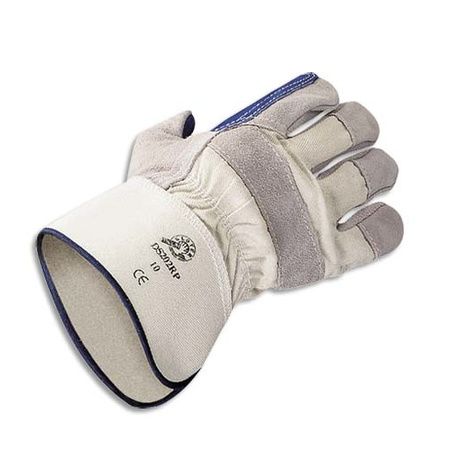 Gants en croûte de cuir de bovin. Renfort cuir sur la paume, le pouce et l'index. Dos et manchette toile. Elastique de serrage au dos. Très bonne résistance mécanique. Taille unique. Lot de 12 paires.