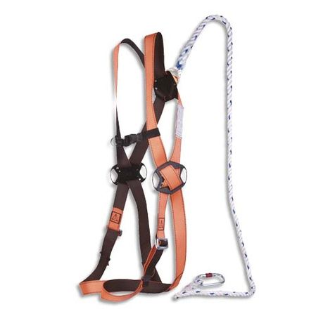 Kit prêt à l'emploi : Harnais en polyester 1 point d'accrochage antichute (dorsal), 2 boucles de réglage, 2 plaques latérales de réglage, avec longe polyamide en corde toronnée Ø 12 mm inamovible. Longueur 1,50 m. 1 mousqueton en acier AM002. Norme CE, EN358 testé à 140 kg et EN361 à EN365. Cet ensemble indissociable est conforme aux exigences essentielles de la Directive 89/686/CEE, notamment en terme de conception, d'ergonomie et d'innocuité.