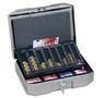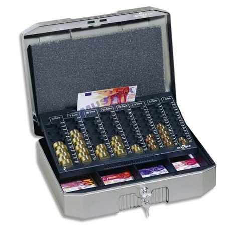 En acier traité hautement résistant avec poignée ergonomique escamotable en polyamide, renforcée de fibres de verre. Planche de comptage amovible composée de 8 compartiments pour les pièces d'une capacité totale de 233,90¤. Cases à pièces disposées de manière décalée et marquage des valeurs des pièces en face des compartiments. Plateau amovible composé de 4 compartiments dédiés aux billets, justificatifs ou reçus. Couvercle rembourré en mousse. Livrée avec deux clés numérotées et serrure à double point d'encrage. (1782-57)