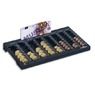 En polystyrène injecté. Planche de comptage d'une capacité totale de 233,90 ¤. Dotée de 8 compartiments à pièces et d'un rangement intermédiaire pour les billets. Le tri, le comptage et la sortie d'argent sont simplifiés grâce aux repérages clairs et aux casiers décalés qui permettent d'avoir une idée précise de la quantité de monnaie disponible. Poignées latérales de préhension ergonomiques, patins antidérapants. Peut se positionner facilement dans un tiroir. (1780-58)
