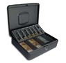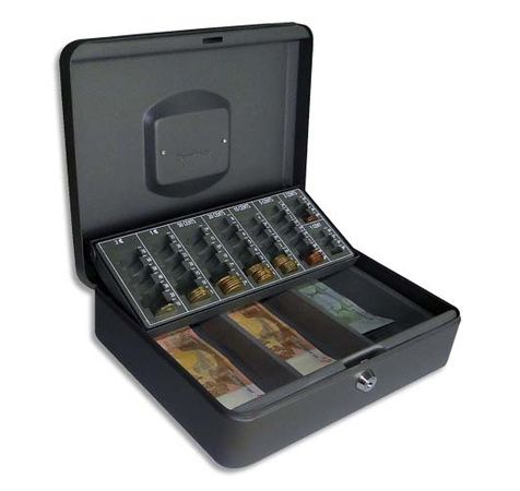 En tôle d'acier 12/10°, laquée époxy. Plateau coulissant et compartiment pour billets. Mousse pour caler les pièces lors du transport. Fermeture par pêne pivotant. Livré avec 2 clés. Coloris noir.