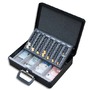 En tôle d'acier 12/10°, laquée époxy. Plateau coulissant et compartiment pour billets. Mousse pour caler les pièces lors du transport. Fermeture par pêne pivotant. Livré avec 2 clés. Coloris noir.