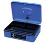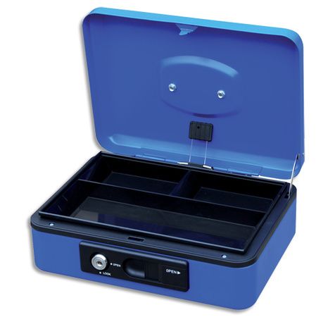 Caisse à monnaie 30cm/3 comp. ouv. auto bout. poussoir+serrure cylindrique Bleue