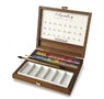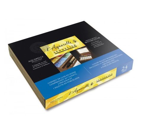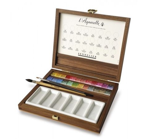Un superbe coffret en noyer de 24 ½ godets d'aquarelle extra-fines au miel Sennelier avec une palette en porcelaine et 2 pinceaux pour l'aquarelle, un coffret somptueux à offrir ou à s'offrir.