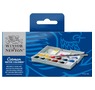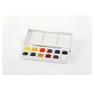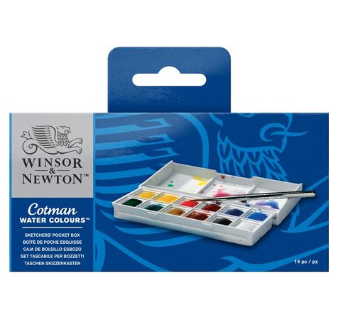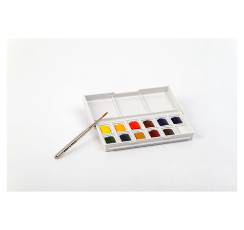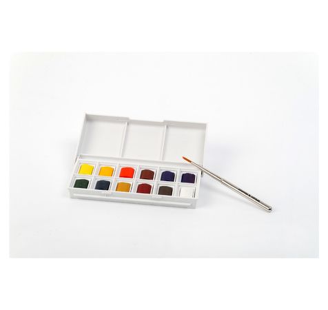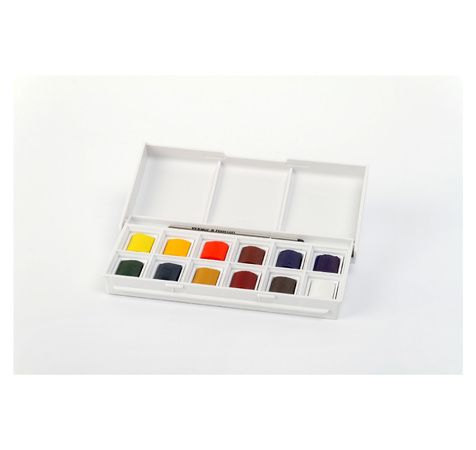Cette boîte de poche en plastique, très populaire, comprend une palette de mélange intégrée dans le couvercle, et contient : Un Pinceau de Poche, 12 demi-godets d’aquarelle Cotman: Jaune Citron, Jaune Cadmium, Rouge Cadmium Pâle, Alizarin Cramois, Outremer, Bleu Intense, Vert Emeraude, Vert de Vessie, Ocre Jaune, Terre Sienne Brûlée, Ombre Brûlée, Blanc de Chine. Le contenu des sets peut être modifié.