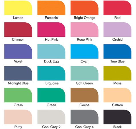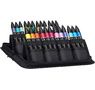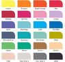 Les couleurs présentes dans la trousse : Citron, Citrouille, Orange brillant, Rouge, cramoisi, Rose éclatant, Rose, Orchidée, Mauve, Oeuf de canard, Cyan, Bleu franc, Bleu nuit, Turquoise, Vert doux, Mousse, Herbe, Vert, Cacao, Safran, Mastic, Gris froid 2, Gris froid 4, Noir).
