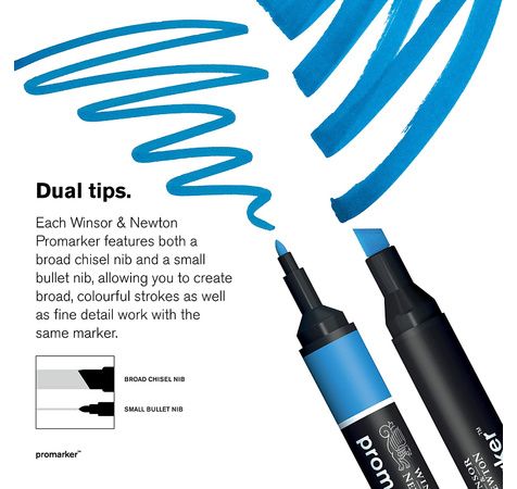 Les Promarkers de Winsor & Newton sont des marqueurs doubles-pointe : une fine et une large. La pointe fine est idéale pour des tracés de précisions et réaliser des détails tandis que la pointe large sera parfait pour vos réalisations de visuels rapides et le travail sur de grandes zones.